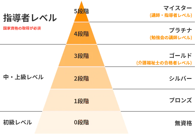 ケアマイスターとは、介護士の知識・技術の高水準・均一化をはかり、スタッフの介護技術レベルがどの程度かを、5段階で認定する仕組みです。